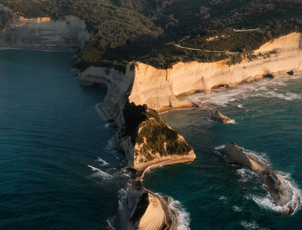 Das Kap Drastis an der Nordwestküste der griechischen Insel Korfu ist eines der bezauberndsten Naturphänomene im Ionischen Meer. Dieses Drohnenfoto, aufgenommen während der goldenen Stunde, zeigt die einzigartige Schichtung der weißen Kalksteinklippen, die dramatisch ins Meer ragen. Das warme Licht der untergehenden Sonne hebt die Struktur der Klippen hervor, während das klare blaue Wasser darunter einen beruhigenden Kontrast bildet.