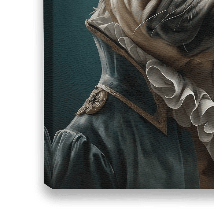 Ein charmanter und robuster Mops, dargestellt als distinguierter Piratenkapitän, gekleidet in raffinierter Renaissance-Kleidung mit exquisiten Details. Der Hund trägt einen klassischen, verwitterten dreieckigen Hut, eine marineblaue Jacke und einen eleganten, gefalteten weißen Kragen. Dieses einzigartige und verspielte Porträt verbindet…