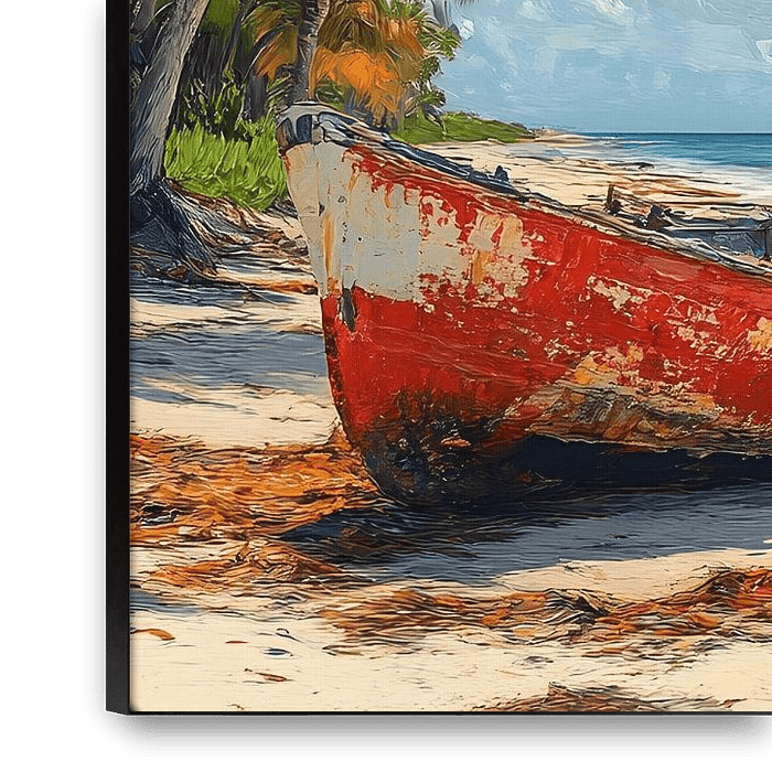 Das Ölgemälde fängt die stille und doch eindrucksvolle Schönheit eines kubanischen Strandes ein, dominiert von einem alten roten Boot, das einsam auf dem weißen Sand ruht. Die abblätternde Farbe des Bootes erzählt Geschichten vergangener Abenteuer und verleiht der Szene eine nostalgische Note.
