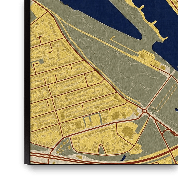 Diese Karte des Zentrums von Deventer ist von der Farbpalette des Gemäldes "Der Kuss" von Gustav Klimt inspiriert. Die dunkelblauen und orangefarbenen Töne verleihen dieser Karte des Zentrums von Deventer einen Art-Deco-Look.