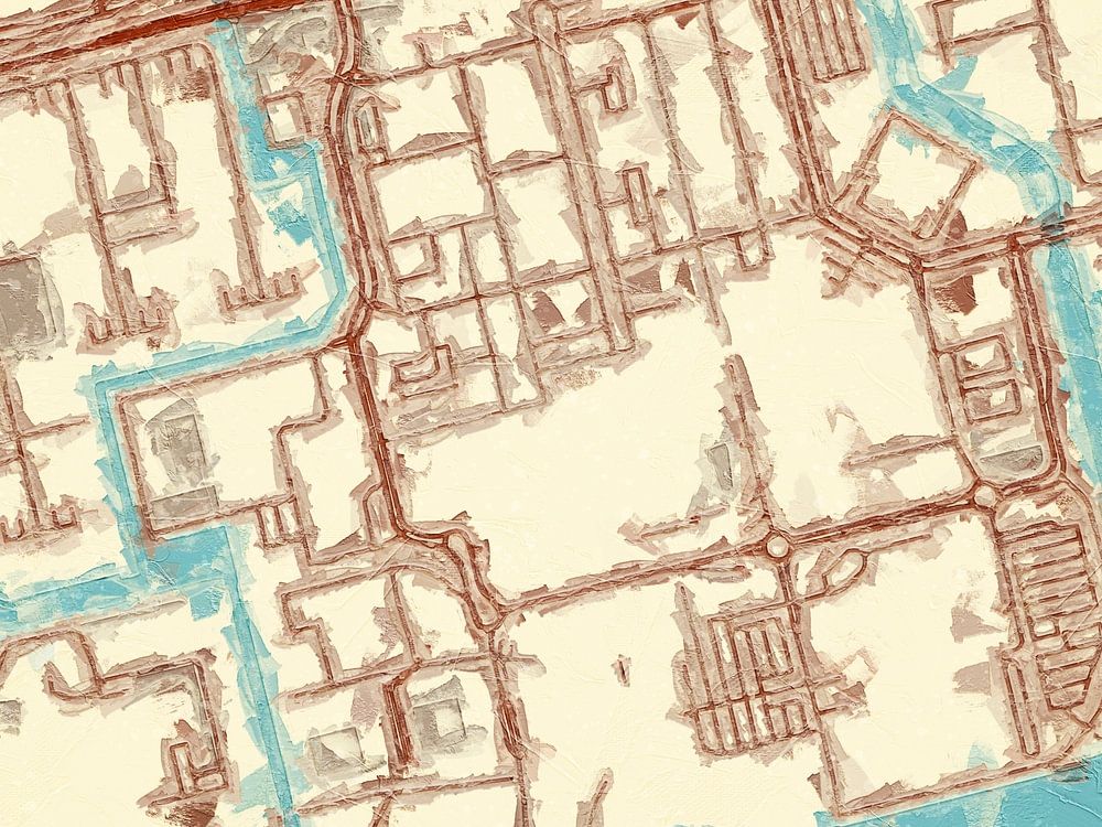 Hiermit präsentieren wir eine Karte von Almere Centrum im Stil Blau & Creme. Diese digitale Malerei zeigt einen cremefarbenen Hintergrund, der Ruhe symbolisiert, während die hellblauen Nuancen die Wasserwege darstellen und die lebendig roten Straßen die Straßen der Stadt betonen.