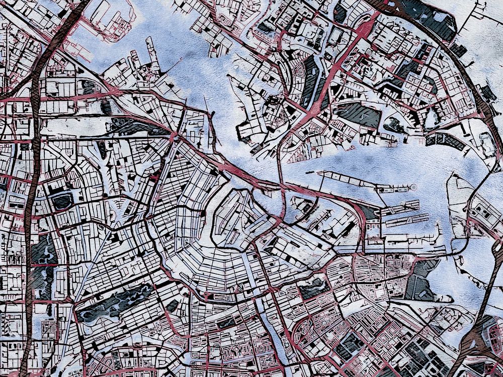 Diese Karte von Amsterdam trägt unseren maßgeschneiderten Stil „White Winter“. Die dunkelroten Straßen ziehen sich wie eine warme Arterie durch die kalte Winterlandschaft. Ein dicker weißer Schnee bedeckt die Felder und die Stadt, während die Vegetation ihre Blätter verloren hat und sich im Dunkeln auf den Frühling vorbereitet. Diese Winterkarte von Amsterdam verleiht Ihrem Interieur einen frischen Look.