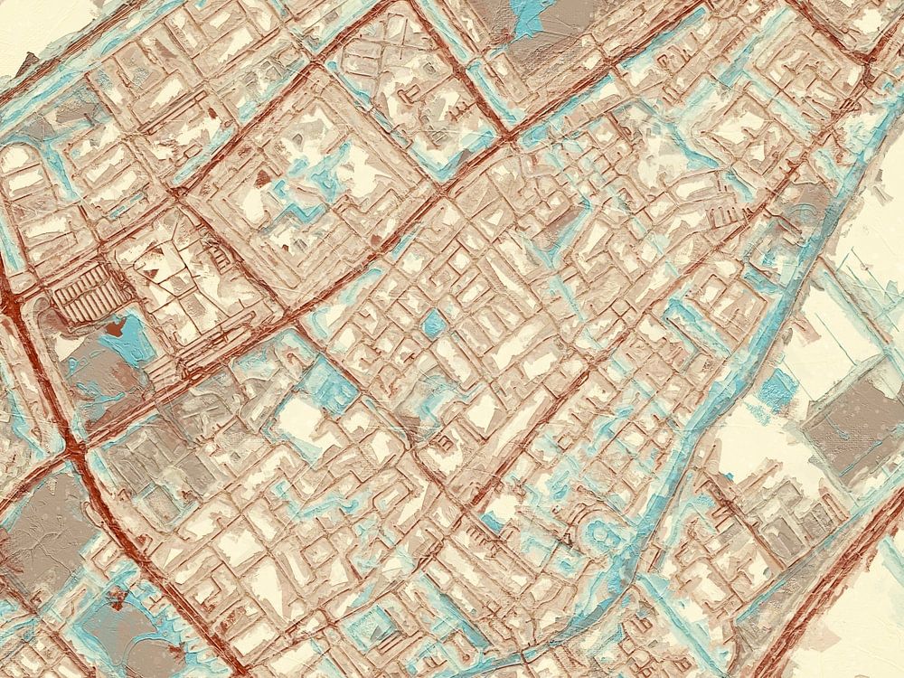Hiermit präsentieren wir eine Karte von Leidschendam im Stil Blau & Creme. Diese digitale Malerei zeigt einen cremefarbenen Hintergrund, der Ruhe symbolisiert, während die hellblauen Nuancen die Wasserwege darstellen und die lebendig roten Straßen die Straßen der Stadt betonen.