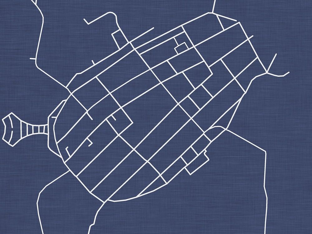 Erkunden Sie Naarden mit dieser Karte im Royal Blue-Stil. Die weißen Straßen setzen sich kontrastreich gegen einen tiefblauen Hintergrund ab. In Kombination mit einer subtilen Leinentextur verleiht diese Karte jedem Raum, in dem sie aufgehängt wird, eine Note von Raffinesse und Ruhe.
