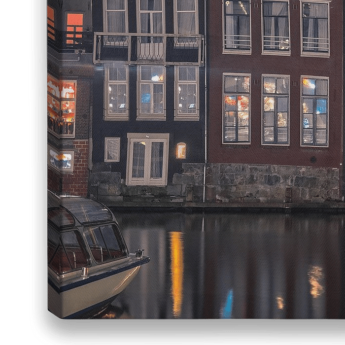 Die charakteristischen Häuser am Damrak in Amsterdam. Sie sind schottisch und krumm, was ihnen ein einzigartiges Aussehen verleiht. Da das Foto bei Nacht aufgenommen wurde, erzeugt die Innenbeleuchtung der Häuser eine schöne Spiegelung im Wasser draußen.