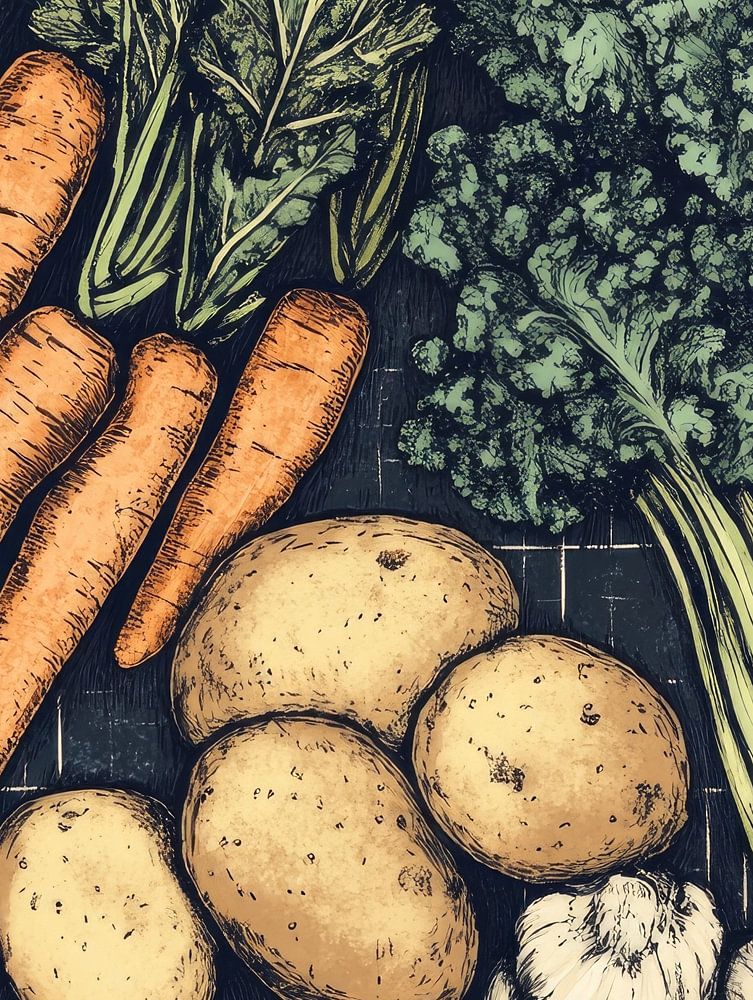 Eine lockere Komposition aus geschnittenem Gemüse und Knoblauch mit Vintage-Charme. Dieser Druck strahlt Ruhe und Einfachheit aus - mit dem Charme von Linoleumdruck und alten Küchen.