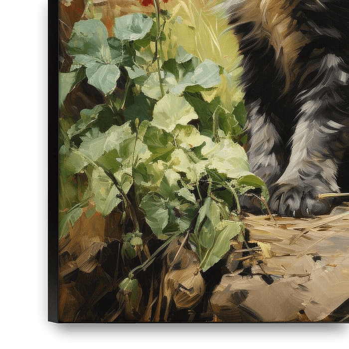 Malerische Darstellung einer dunklen Katze, umgeben von Pflanzen.