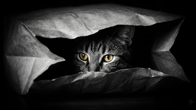 Zwei goldgelbe Augen blicken dich aus der Dunkelheit an. Versteckt hinter zerrissenem Packpapier – halb sichtbar, halb verborgen – beobachtet die Katze die Welt nach ihren eigenen Regeln. Es ist ein Blick, der dich nicht loslässt. Neugierig, selbstbewusst und leicht provokativ.