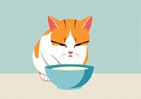 eine rote orange Katze trinkt Milch aus einer blauen Schüssel auf weichen blauen Hintergrund Illustration Inspiration.