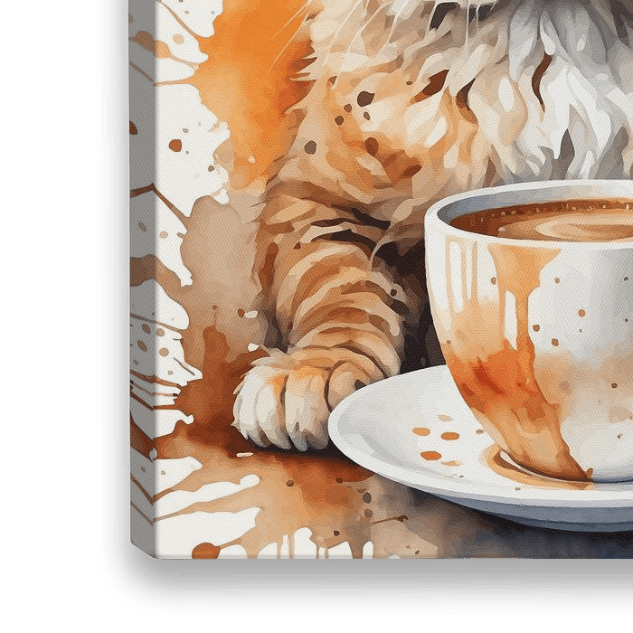 Bestelle diese Malerei Katze und Kaffee Aquarell von MIROKKU als Reproduktion auf Leinwand, Alu-Dibond, als Poster, Fototapete oder Acrylglasbild.