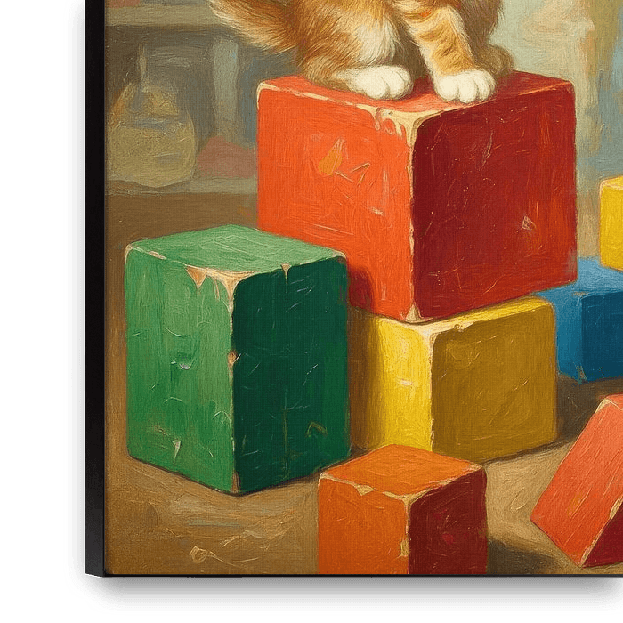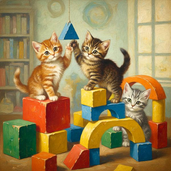 Drei Kätzchen spielen vergnügt inmitten eines Stapels bunter Bausteine. Ihre lebhaften Gesichtsausdrücke und ihr weiches Fell tragen zum Charme der Szene bei.
