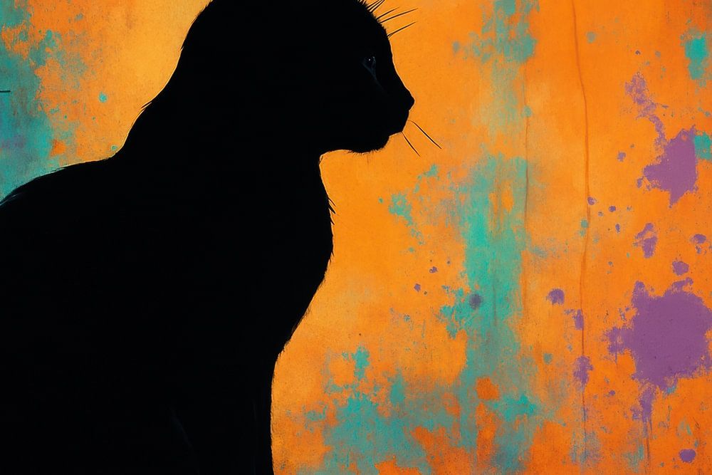Eine anmutige Katze in Silhouette sitzt still vor einem Fenster, eingerahmt von einem schlanken Ast und verspielten Farbspritzern. Ein warmes Licht strömt von hinten herein, während kühle Töne um den Fensterrahmen herum einen starken Kontrast bilden. Die weichen Kanten der Schattenform und die rauen, strukturierten Spritzer verleihen…
