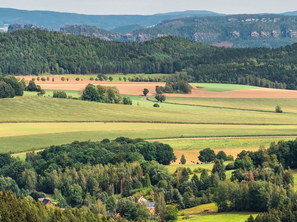 Über den Baumspitzen dünnt der Wald schon aus, es wird Zeit für die erste Aussicht des Katzsteins. Nur noch ein paar Stufen und es ist soweit, das Signal im Norden des Katzsteins erreicht. Dann gibt es eine Aussicht, weit über das Gebiet der Steine, über die Schrammsteine, bis zu den Zschirnsteinen. So eine famose Sicht würde man dem kleinen Felsen noch während des kurzen Aufstiegs gar nicht zutrauen.