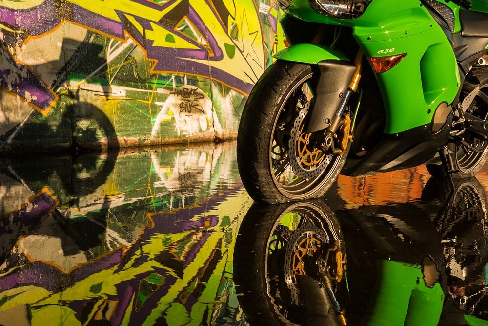 Kawasaki ZX-6R 2005 in einer Wasserpfütze vor einer Wand voller Graffiti bei Sonnenuntergang mit einem schönen Schatten im Hintergrund.