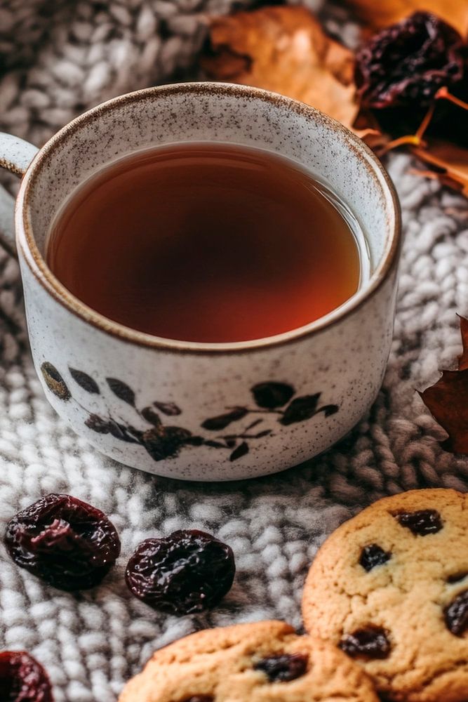 Ein gemütliches Zusammenspiel von herbstlichen Farben und Aromen entfaltet sich: Ein dampfender Teebecher schlängelt sich neben knusprigen Cookies, gespickt mit Schokoladensplittern. Das warme, graue Strickmuster der Decke lädt zum Entspannen ein, während goldene Laubblätter und dunkle Trockenfrüchte die Szene harmonisch vervollständigen. Ein Genuss für die Sinne in einem kuscheligen Moment