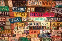 Viele verschiedene Nummernschilder aus den Staaten von Amerika und Kanada, montiert an einer Wand eines Restaurants in Los Angeles. Die Nummernschilder sind mit einigen Weihnachtslichtern und ein paar Fotos geschmückt. Die farbigen Nummernschilder ergeben zusammen eine schöne Wanddekoration, die im Stil von Polaroid im Retro-Look wirkt.