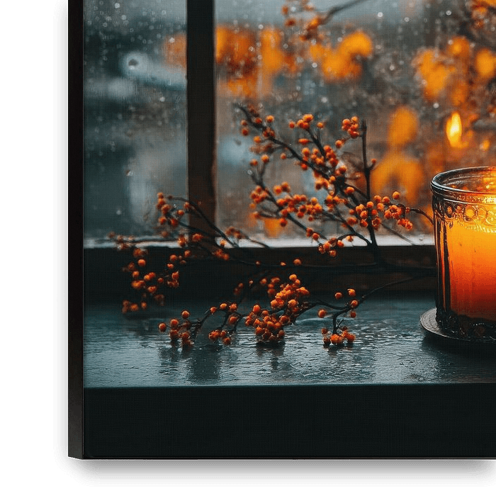 Draußen verschwimmen bernsteinfarbene Blätter und leuchtend orangefarbene Beeren im Hintergrund, deren Farben durch das Grau des Regentages noch verstärkt werden. Die Tropfen auf dem Glas fangen das Flackern…