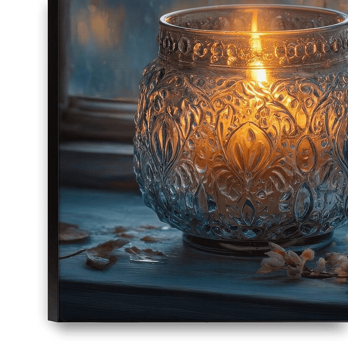 Eine einzelne Kerze brennt in einem verschnörkelten Glasgefäß, ihre Flamme wirft bernsteinfarbenes Licht durch geprägte Muster. Außerhalb der Scheibe perlen Regentropfen ab und lassen die Welt in weichen Kreisen verschwimmen, während sich ein zarter Zweig mit kleinen getrockneten Blüten über die Szene beugt.