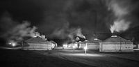 Schwarz-Weiß-Bild eines Jurtenlagers mit rauchenden Schornsteinen in der Nähe der Stadt Kharkhorin in der Zentralmongolei.