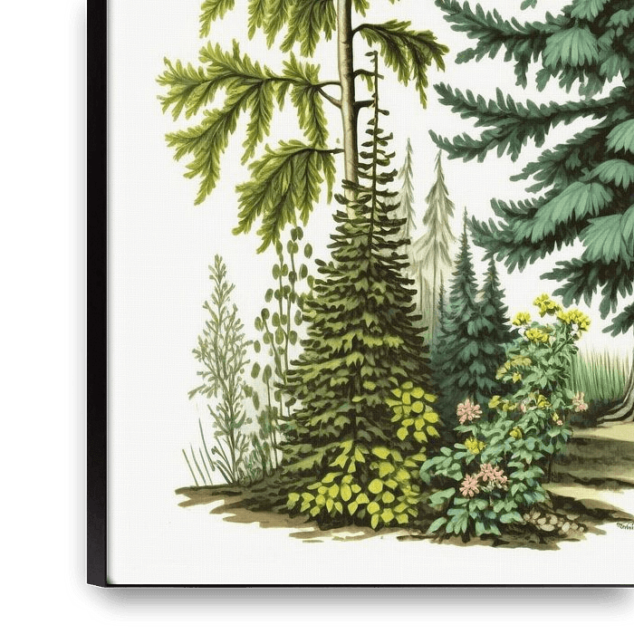 Eine fein gerenderte digitale Illustration mit zwei unterschiedlichen Bäumen: eine hohe, majestätische Kiefer und eine kürzere Alpenfichte mit zarten, kompakten Ästen. Vor einem sauberen weißen Hintergrund zeigt die Szene leuchtend grünes Laub und zartgelbe Blüten, die auf dem Waldboden vor der Kiefer verstreut sind. Das Kunstwerk zeigt…