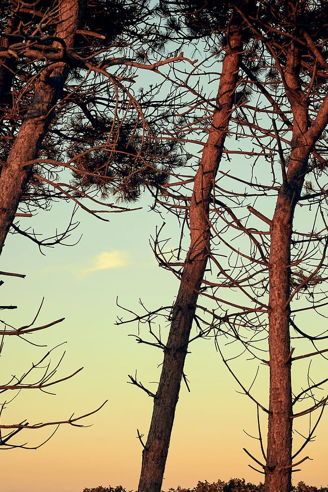 Diese vereinzelt stehenden Kiefernbäume glänzen rot im Abendlicht der untergehenden Sonne. Sie stehen auf einer Wiese, die mit hohem Gras bewachsen ist und im Hintergrund erahnt man das Meer und sieht den farbigen Himmel in der Abenddämmerung.