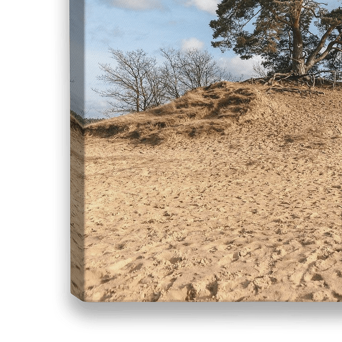 Sandebene mit Baum auf der Sanddüne. Spuren von Wildtieren und Wanderern unter blauem Himmel. Wolkenhaufen über der Sandverwehung von Kootwijk im Frühling in den Niederlanden