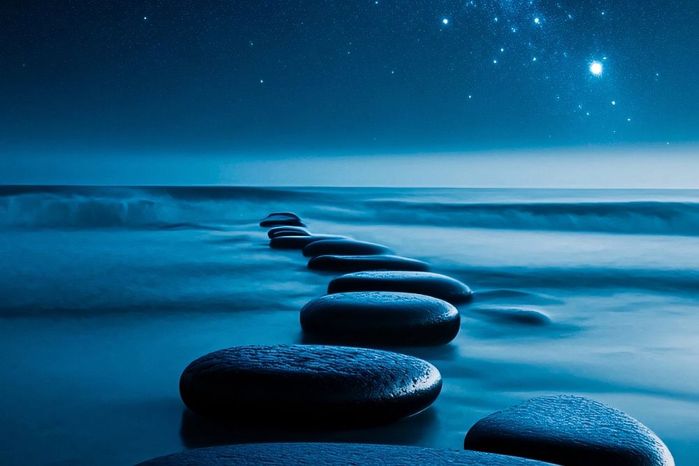 Dieses einzigartige Design bietet eine wunderschöne Kombination aus natürlichen Elementen und einer ruhigen Atmosphäre. Mit glatten schwarzen Kieselsteinen, die im Wasser zu schweben scheinen, und einem atemberaubenden Sternenhimmel im Hintergrund vermittelt dieses Kunstwerk ein Gefühl von Ruhe und unendlichen Möglichkeiten. Das Design eignet sich ideal als Wanddekoration in Räumen wie Schlafzimmern, Büros oder Wohnzimmern, in denen ein beruhigender Look gewünscht ist. Seine sanften Farben und sein minimalistischer Charakter machen es perfekt für moderne Innenräume. Lassen Sie sich von der Magie dieser bezaubernden Landschaft inspirieren und schaffen Sie einen Raum, in dem Sie sich vollkommen entspannen können.