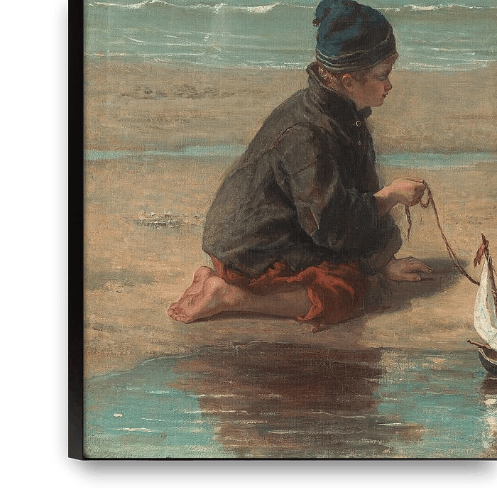 Ein Junge auf den Knien, bekleidet mit einer Jacke, roten Buchten, Hosen und einem Wollhut, lässt ein Spielzeugboot in einer Pfütze mit Meerwasser am Strand segeln. Ein Mädchen in einem roten Rock mit einer weißen Mütze auf dem Kopf sieht mit verschränkten Armen zu. Im Hintergrund das Meer mit einem Boot und darüber ein blauer Himmel.