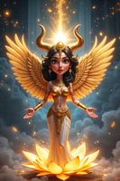 In einer himmlisch leuchtenden Szenerie, getragen von sanften Wolken und goldenem Licht, erscheint eine anmutige Gestalt mit ausgebreiteten Flügeln und ruhiger, liebevoller Ausstrahlung. Über ihr strahlt ein warmes Licht wie eine schützende Sonne, während sie auf einer leuchtenden Lotusblüte schwebt. Ihre Haltung ist offen und…
