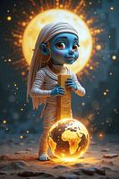 In einer stillen, leuchtenden Szenerie, durchzogen von warmem Licht und sanften, goldenen Partikeln, steht eine kleine, ruhige Gestalt im Zentrum einer Welt voller Möglichkeiten. Vor ihm schwebt eine strahlende Kugel, die wie ein eigenes Universum wirkt, während ein kraftvolles Zepter in seinen Händen ruht. Die Umgebung ist von einer…