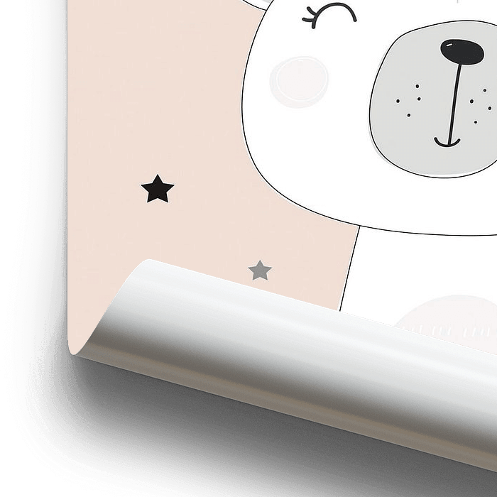 Kinderzimmer Poster mit lustigem Bär Frecher Bär mit goldener Krone auf hellrosa Hintergrund. Dieses Poster passt gut zu den anderen Postern dieser Serie. Hängen Sie sie zusammen auf oder verteilen Sie sie auf verschiedene Wände.