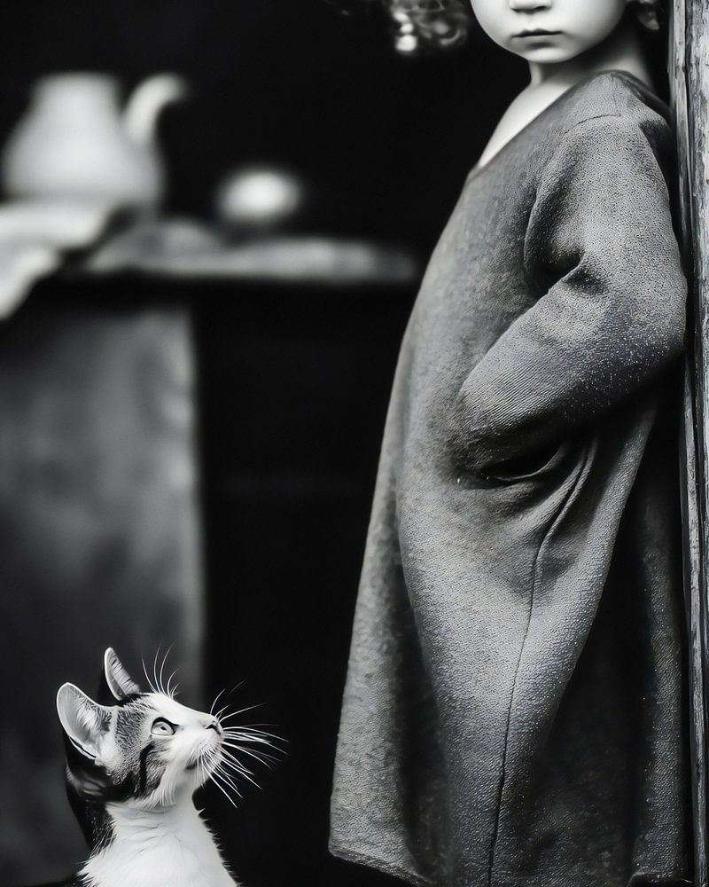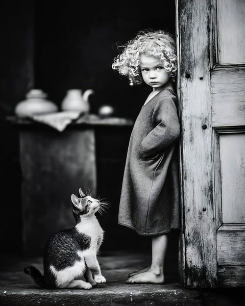 Schwarz-Weiß-Porträt einer Katze und eines aufgeweckten kleinen Mädchens mit Locken. Nostalgie; ich war selbst ein kleines aufgewecktes Mädchen mit Locken und lief immer mit einer Nachbarskatze im Arm herum ;)