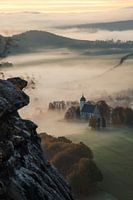 Blick auf die Kirche in Papstdorf zu Sonnenaufgang von der Berg Papststein aus in der Sächsischen Schweiz / Sachsen / Deutschland.