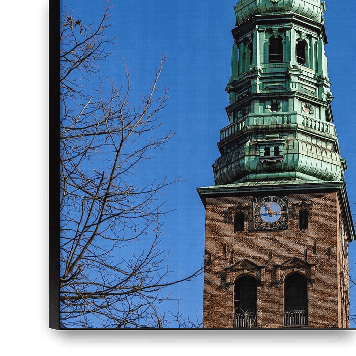 Bestelle das Foto Kirchturm der St.-Nikolaus-Kirche in Kopenhagen, Dänemark von Adelheid Smitt als Reproduktion auf Leinwand, Alu-Dibond, als Poster, Fototapete oder Acrylglasbild.
