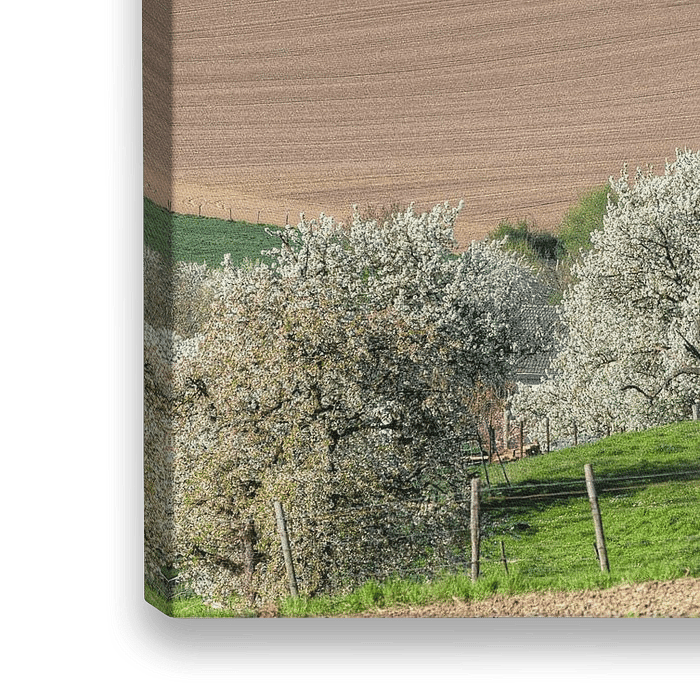 Kirchturm von Eys zwischen den Blüten auf den Hügeln Südlimburgs