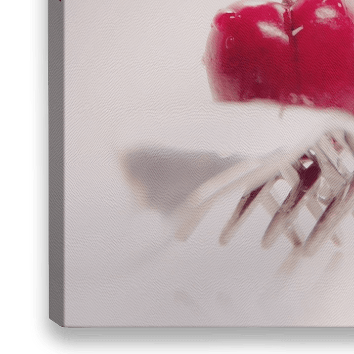 Minimalistisch im Design, frische rote Kirsche auf zwei Gabeln im Makroformat dargestellt. Dekoratives für die Küche und jeden Essbereich.