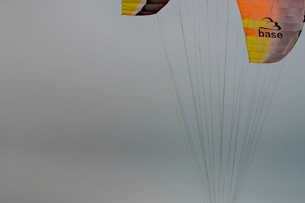 Entlang der Dünen von Surtainvilles weitem Strand, schwimmen die Kitesurfer mit ihren bunten Fallschirmen über dem Strand, mit dem Atlantik-Hintergrund.