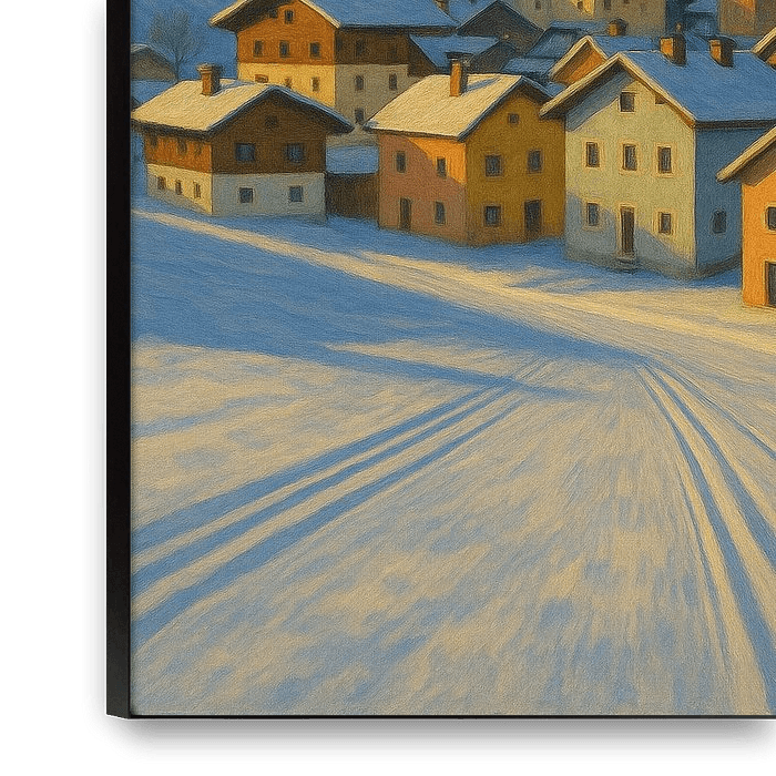 Goldenes Licht umspielt die pastellfarbenen Häuser von Kitzbühel, die alle mit Schnee bedeckt sind, der unter den weiten österreichischen Alpen liegt. Die Dorfkirche steht in der Mitte wie ein Zeitmesser, ihr Uhrenturm leuchtet in den ersten Strahlen des Tages. Lange Schatten erstrecken sich über die Felder und ziehen den Betrachter…