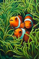 In einer lebendigen Unterwasserwelt tummeln sich leuchtend orangefarbene Clownfische inmitten üppiger, grüner Seeanemonen. Ihre charakteristischen weißen Streifen heben sich klar ab und verleihen dem Szenario eine fröhliche Note. Die sanften Bewegungen der Anemonen umrahmen die Fische, während sie neugierig ihre Umgebung erkunden. Ein…