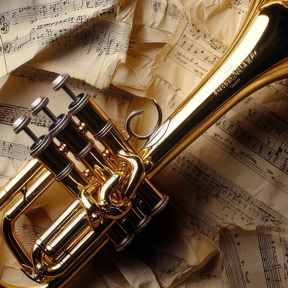 Glänzendes Gold trifft auf zerknitterte Notenblätter: Eine Trompete ruht majestätisch auf einem Meer aus nostalgischen Melodien. Ihre geschwungenen Formen laden ein, in klangvolle Geschichten einzutauchen, während die vergilbten Seiten von vergangenem musikalischen Glanz erzählen. Hier verschmelzen Erinnerung und Harmonie zu einem visuell klingenden Kunstwerk.