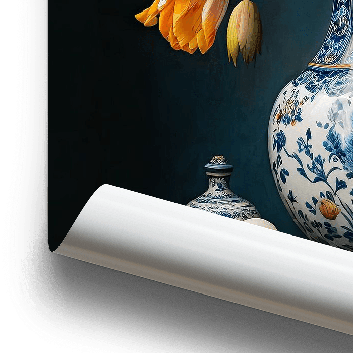 Bestelle dieses Blumen-Wandbild Klassisch dekorierte Vase mit orangefarbenen Tulpen von Vlindertuin-Art als Reproduktion auf Leinwand, Alu-Dibond, als Poster, Fototapete oder Acrylglasbild.