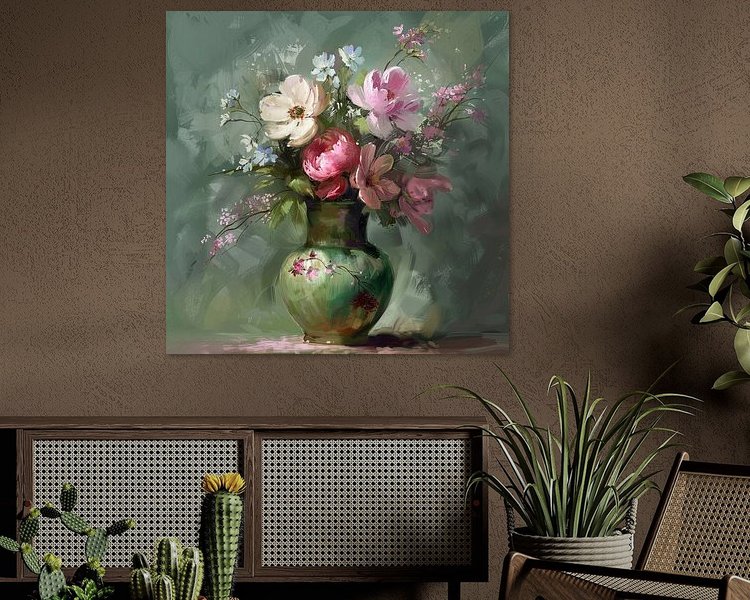 klassisches Blumenarrangement, grüne Vase, romantische Kunst, malerischer Stil, Vintage-Interieur, zeitlose Schönheit, florale Schönheit, elegante Kunst, Natur, Arbeit an der Wand, warme Atmosphäre, detaillierte Blumen