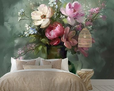Die lockeren Pinselstriche und die detaillierten Blumen verleihen dem Arrangement einen romantischen und klassischen Look, der ideal für ein klassisches oder Vintage-Interieur ist.