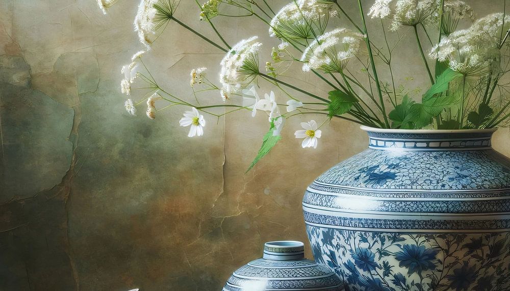 In diesem breiten Bild sehen wir eine klassische Stilllebenszene, die zeitlose Eleganz und Gelassenheit ausstrahlt, mit einem Hauch des traditionellen Delfter Blau. Der Mittelpunkt der Komposition ist eine atemberaubende blau-weiße Porzellanvaser, verziert mit aufwendigen Mustern, die das bekannte Delfter Blau widerspiegeln. Diese exquisite Vase steht auf einem rustikalen Holztisch und verleiht der Gesamtausstrahlung einen Hauch von ländlichem Charme. Interessanterweise ist die Vase teilweise umgekippt, ihr Deckel liegt daneben und erzeugt ein Gefühl von Spontaneität und hält einen Moment in der Zeit fest.