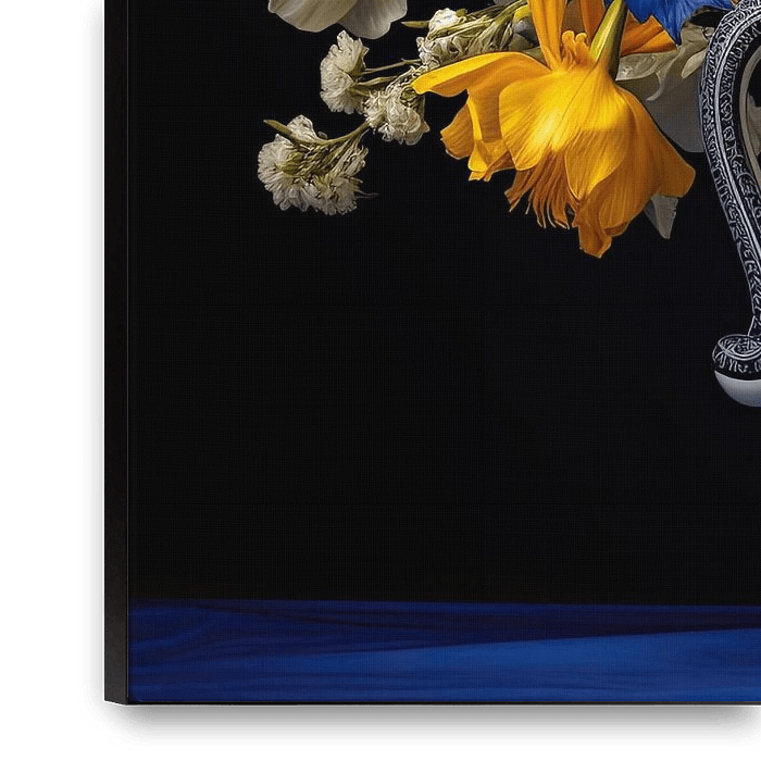 Bestelle dieses Blumen-Wandbild Klassisches Blumenstillleben in Delfter Blau Vase von Vlindertuin-Art als Reproduktion auf Leinwand, Alu-Dibond, als Poster, Fototapete oder Acrylglasbild.