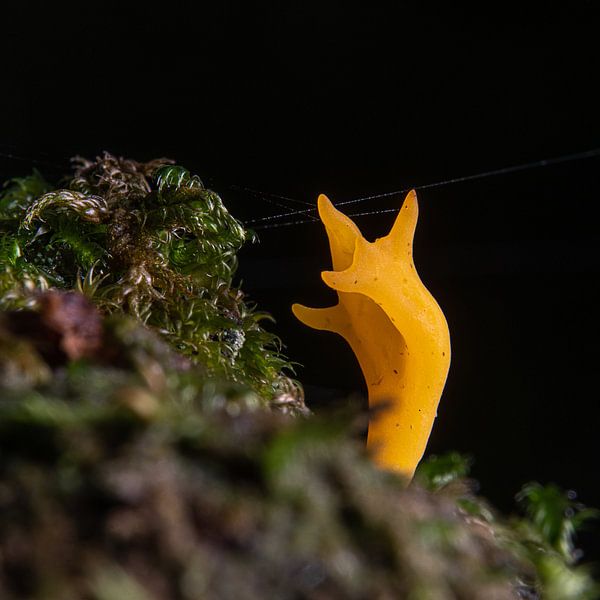 Einzelner Pilz "Klebriger Hörnling " vor schwarzem Hintergrund