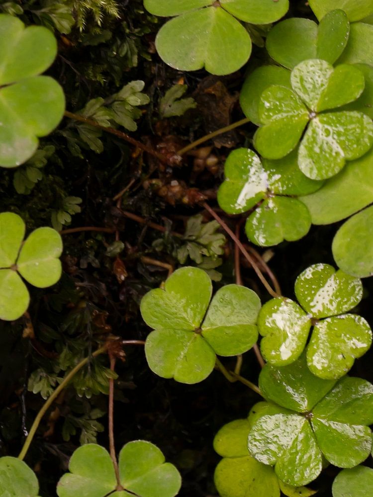 versteckt im Wald, aber ein wenig Tageslicht und der Glanz der Regentropfen fielen mir auf den schönen Blättern des weißen Sauerampfers auf.