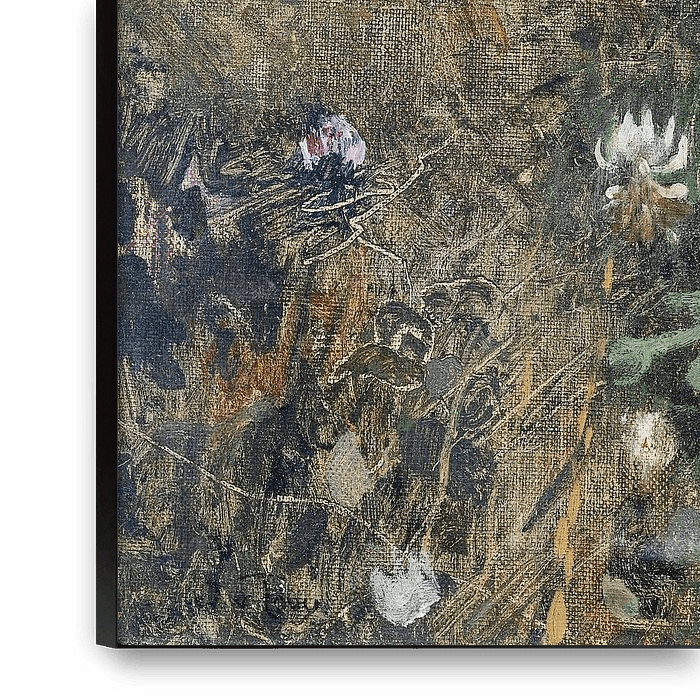 Kleeblumen, Jacobus van Looij Van Looij fertigte diese Studie einer Wiese mit Kleeblumen für ein Gemälde an, das ein im Gras liegendes Mädchen (Aaltje) zeigt. Die Nahaufnahme lässt uns völlig in die Natur eintauchen und lässt uns - wie Aaltje - sofort die Blumen genießen. Van Looij verfolgte diesen Weg weiter und machte Blumen zu seinem Hauptthema, wie in Zomerweelde, dem Gemälde an der gegenüberliegenden Wand.