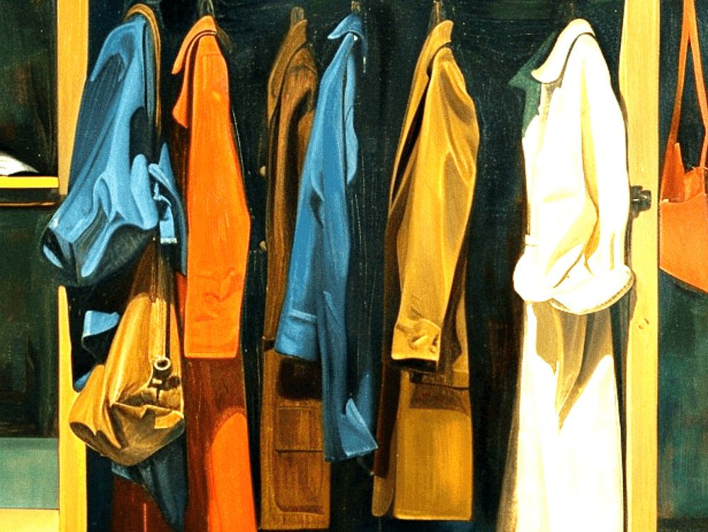 Ein aufgeräumter, altmodischer Kleiderschrank in einem dunklen Grünton präsentiert eine Auswahl an Kleidungsstücken und Accessoires. An einer hölzernen Kleiderstange hängen mehrere Jacken und Mäntel in verschiedenen Farben wie Blau, Orange, Braun und Beige. Darunter stehen ordentlich aufgereiht verschiedene Paar Schuhe, darunter braune Stiefel und elegante Lederschuhe. Auf den oberen Ablagen sind Koffer, Hüte und Taschen verstaut, darunter eine gelbe Tasche, ein grüner Koffer und ein brauner Hut. An den Seitenwänden hängen weitere Taschen und Tücher. Die Szene vermittelt einen Eindruck von Ordnung und persönlichem Stil.