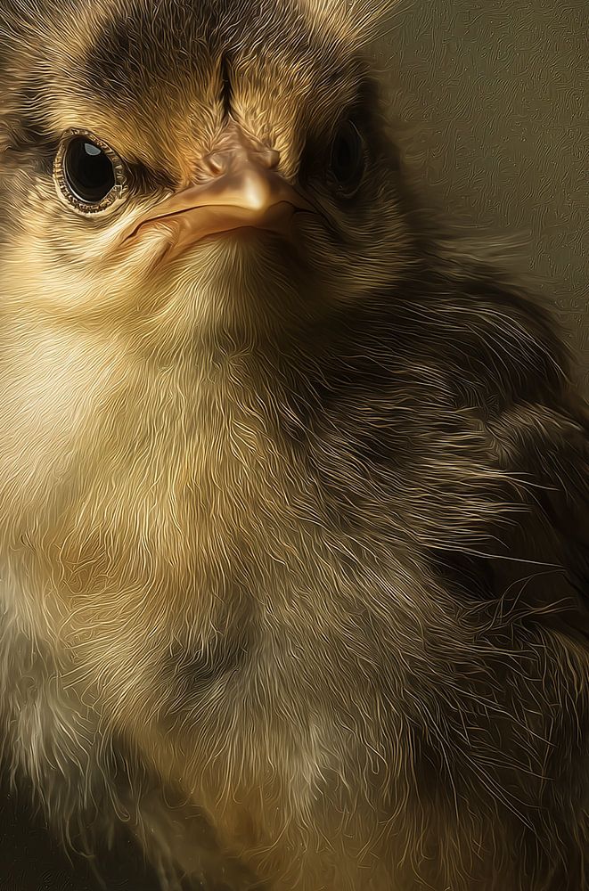 Ein kleines Küken sitzt ruhig im Bild, sein flaumiges Gefieder ist in seiner Weichheit fast greifbar. Die warmen Töne und subtilen Details verleihen dem Bild ein Gefühl von Geborgenheit und Verletzlichkeit. Ein zartes Porträt, das die Reinheit des neuen Lebens unterstreicht.